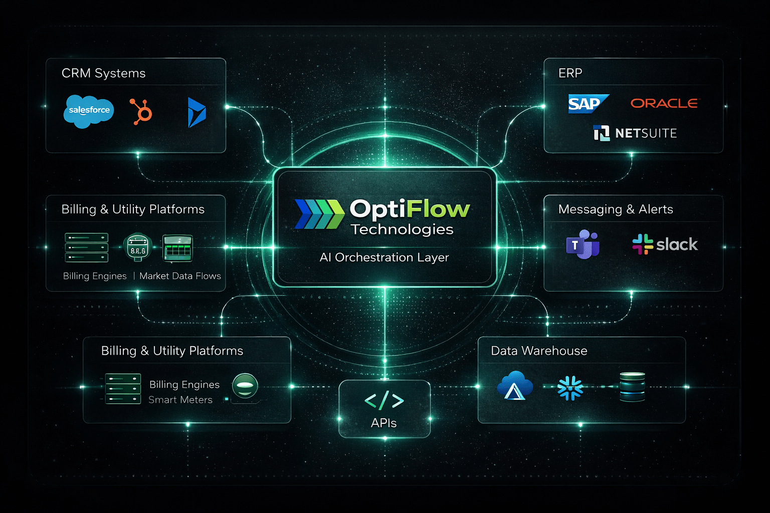 Optiflow sits between your systems and your workflows, acting as a governed intelligence layer that connects CRM, ERP, billing engines, data flows, and communication platforms into a structured automation environment.