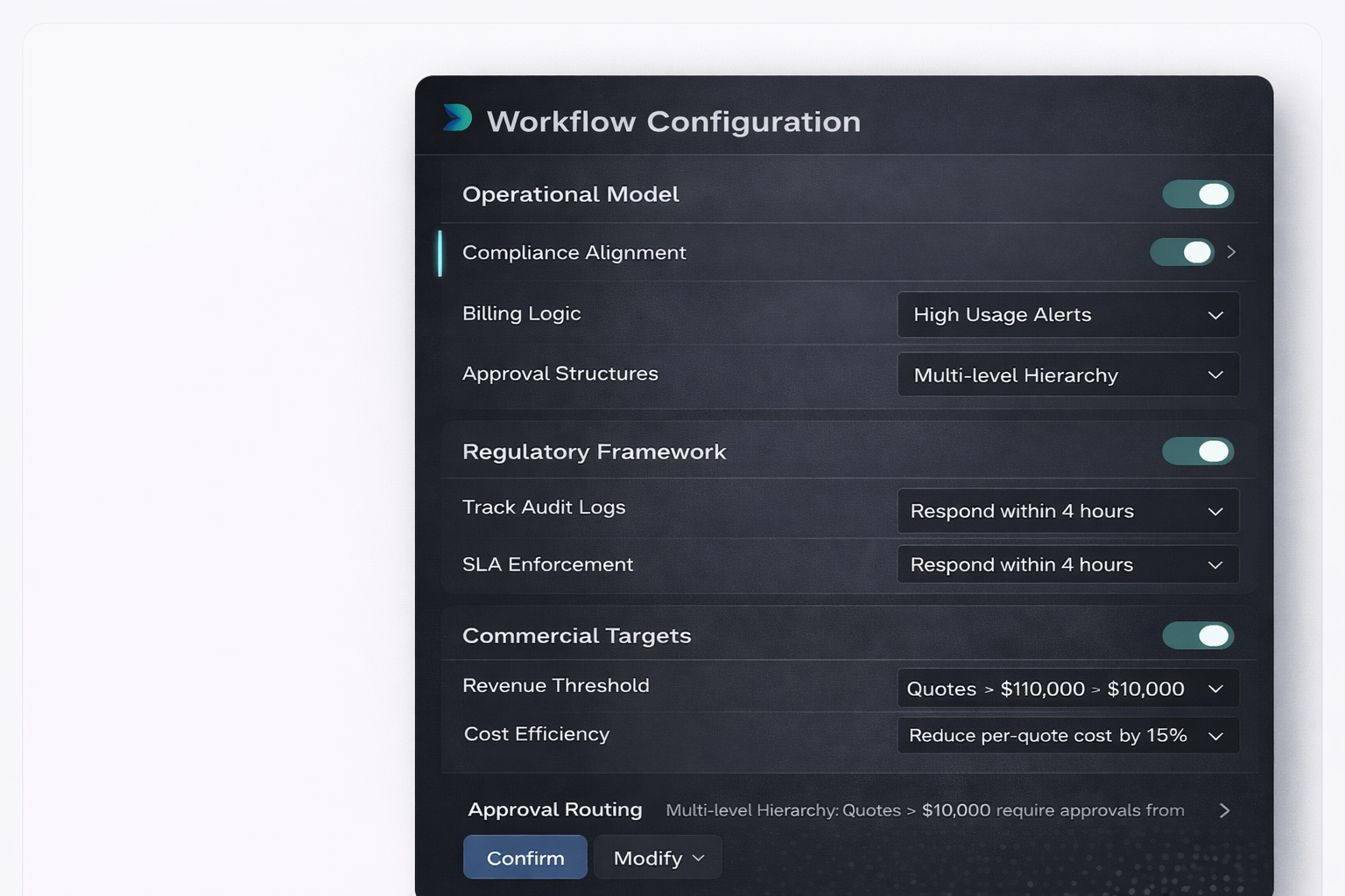 Every agent operates within configurable rules, audit logging, approval thresholds, and monitoring layers. Leaders retain full visibility over performance, risk exposure, and commercial impact.