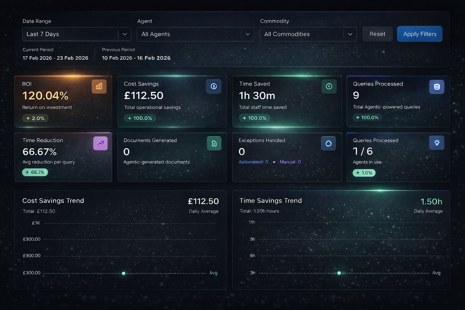 OptiFlow tracks cost savings, time reduction, workflow efficiency, exception handling, and revenue uplift in real time — enabling clear, quantifiable impact reporting.
